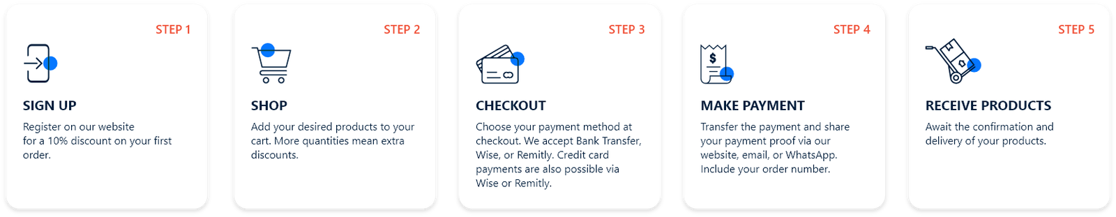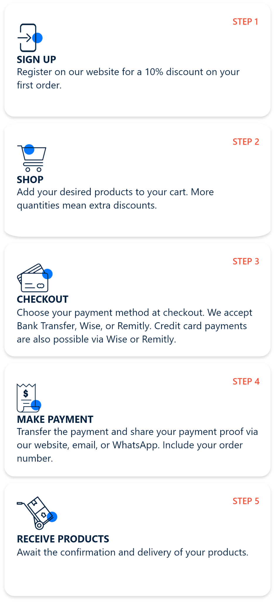 Choose your payment method at checkout. We accept Bank Transfer, Wise, or Remitly. Credit card payments are also possible via Wise or Remitly.