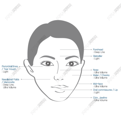 • Facial volumization (forehead, temples, cheekbones, chin, and jawline)